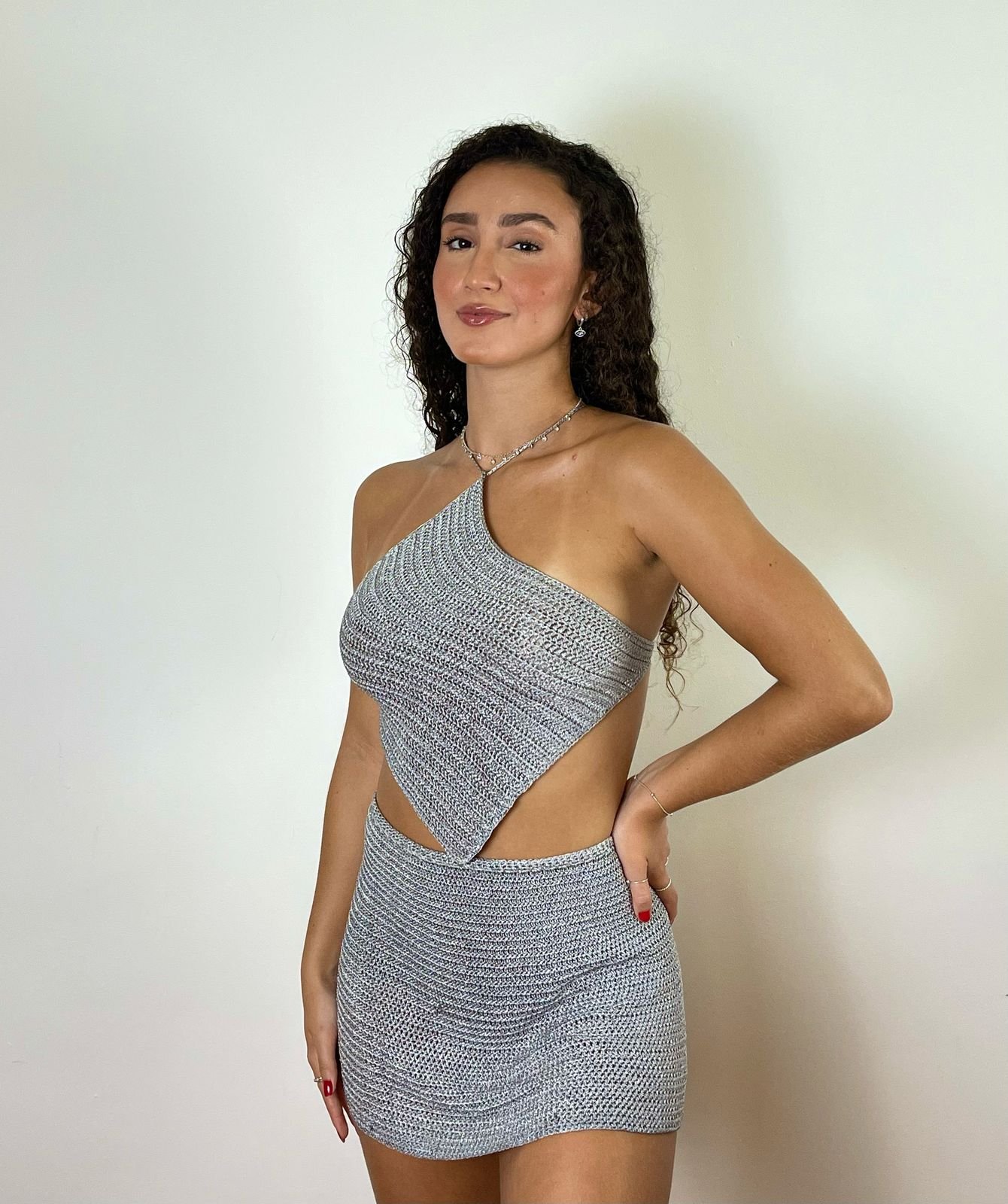 Confeccionado com fios de alta qualidade, este conjunto combina a delicadeza do artesanal com o brilho sutil e elegante, criando um conjunto único e de grande impacto visual.